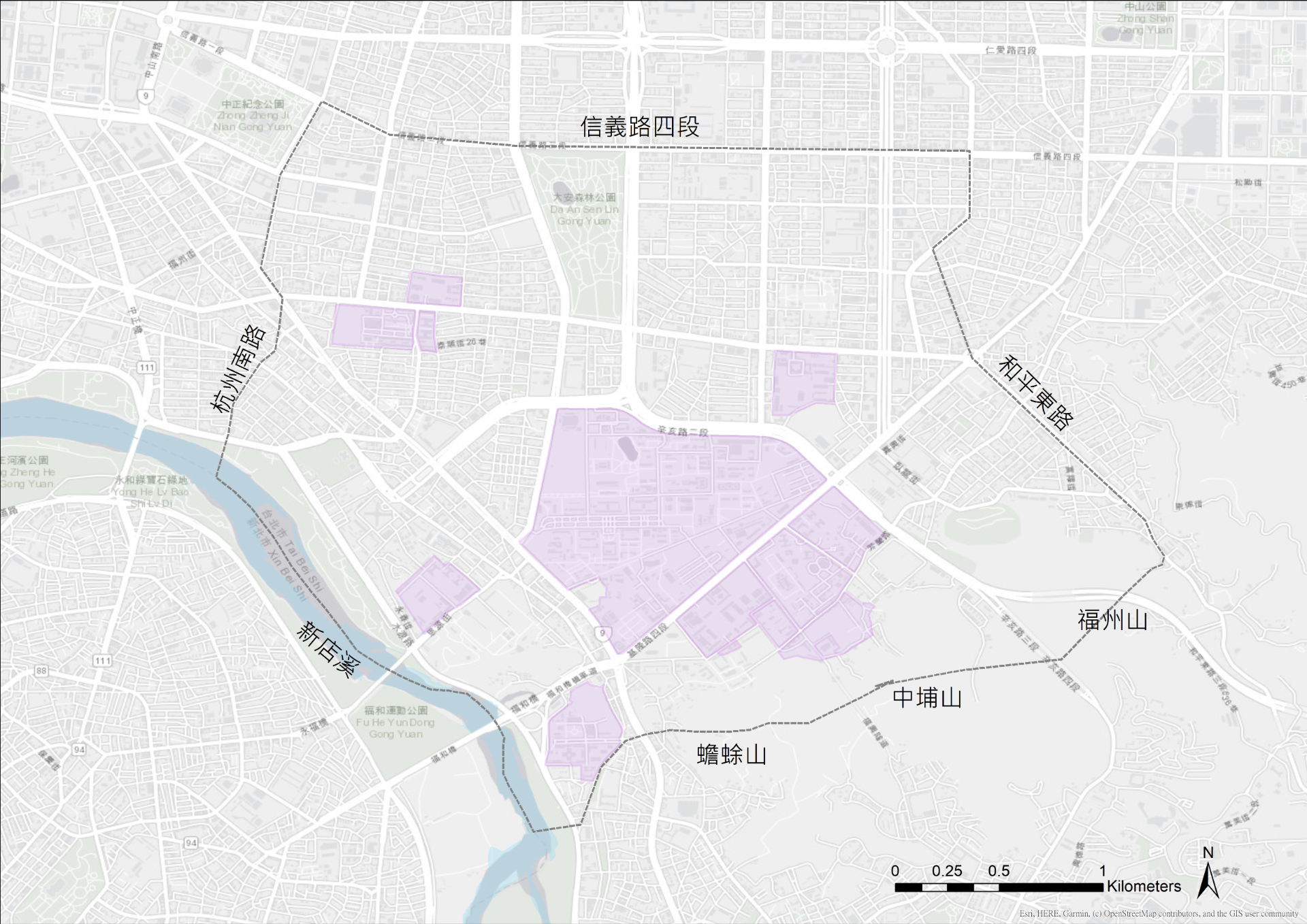 範圍由三校(臺大、臺師大、臺科大)校園邊建立框架,往外擴走路十分鐘之距離(1000M)再以天然屏障新店溪、福州山及北市重要道路為界。