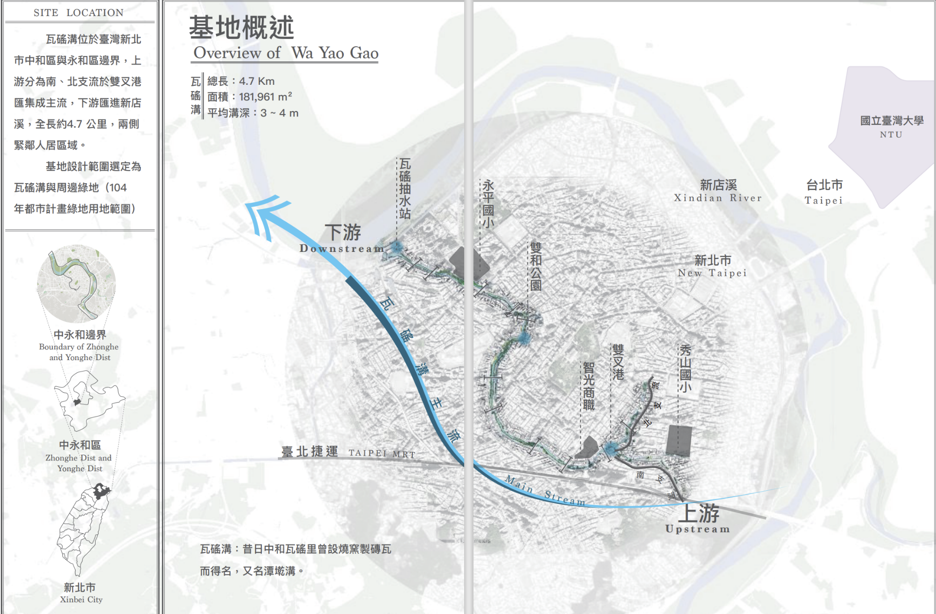 都市快速擴張,新北中永和成為台灣人口密度最高的區域,近年景觀意識提升,曾經的花園城市願景淪為水泥叢林,在其中流淌著一條隱形的河川「瓦磘溝」,期望藉由都市計畫使綠地回歸,打開水道與周邊用地,讓這條藍綠帶亙於中永和中央,突破人與水綠的隔閡,共創更美好的開放空間。
